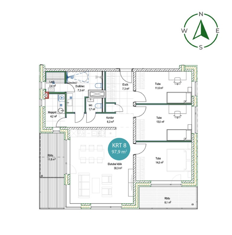 KORTER 8 TUBE 4KORRUS 2PINDALA 97,9 ㎡RÕDU / TERRASS 8,1 ㎡ + 11,8 ㎡MÜÜGIHIND 440 000 €LISAD:PANIPAIGA HIND 5000 €PARKIMISKOHA HIND 8000 €LISAVALIKUD: jahutusvalmidus Võta ühendust Lae alla korteri plaan Galerii